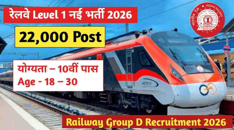 रेलवे भर्ती बोर्ड ने Group D Level-1 पदों के लिए एक शॉर्ट सूचना जारी की है। इस भर्ती में लगभग 22,000 से अधिक पद भरे जाएंगे। यह प्रक्रिया पूरे देश के विभिन्न रेलवे जोन के लिए लागू होगी। इसका आवेदन जनवरी 2026 से शुरू होगा।